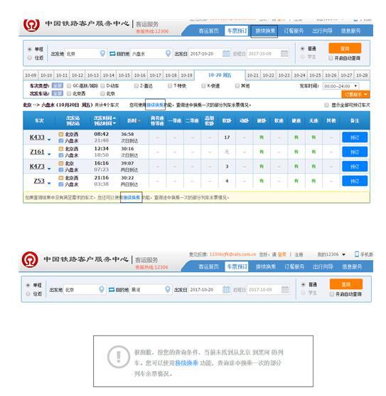 ? ? ? 在沒有符合出行需求的車票時(shí),旅客可使用接續(xù)換乘功能,查詢途中換乘一次的部分列車余票情況。